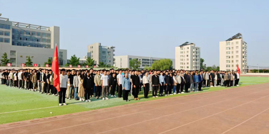 在雄壮激昂的国歌声中,鲜艳的五星红旗冉冉升起,全体师生肃立,齐声高唱国歌,表达了对祖国的崇高敬意与深情热爱。